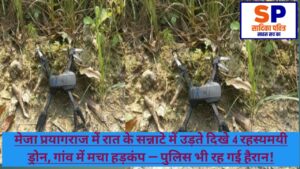 📍प्रयागराज (मेजा) |– शनिवार की रात प्रयागराज जिले के मेजा क्षेत्र में ग्रामीणों ने ऐसा दृश्य देखा जिसे देखकर हर कोई हैरान रह गया। रात करीब 11 बजे आसमान में एक साथ चार रहस्यमयी ड्रोन जैसे उपकरण उड़ते दिखाई दिए। इनमें लाल और हरी रोशनी जल रही थी, जिससे पूरा क्षेत्र दहशत और कौतूहल से भर गया।