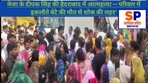 मेजा, प्रयागराज।:- मेजा थाना क्षेत्र के रैपुरा (तंदरीया) गांव निवासी दीपक सिंह (26) ने हैदराबाद में फांसी लगाकर आत्महत्या कर जीवन लीला समाप्त कर लिए। वह वहां की एक निजी कंपनी में कार्यरत था। सोमवार रात दीपक द्वारा उठाए गए इस दर्दनाक कदम से परिवार और गांव में शोक की लहर दौड़ गई।
